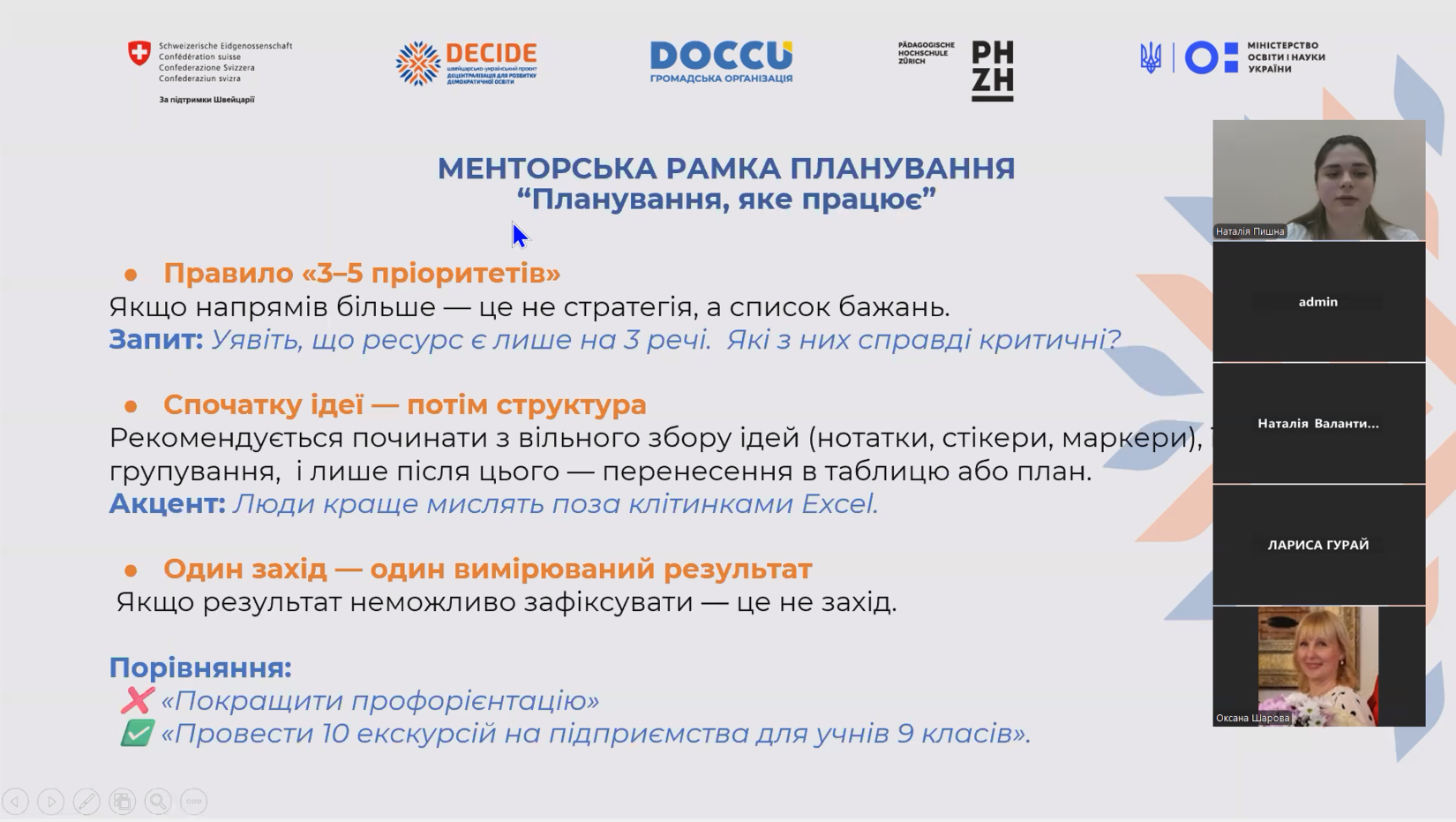 На початку роботи було окреслено тему підсумкової сесії та її цілі. Учасники отримали орієнтири для роботи: під час аналізу спиратися на результати попередніх тем навчання та дані опитувань щодо стану профорієнтації в громадах. Акцент зроблено на важливості формулювання висновків на основі фактичної інформації, а не інтуїтивних припущень.