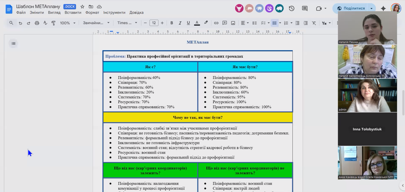 Під час групової роботи із МЕТАпланом «Профорієнтація у територіальних громадах: поточний стан, виклики та можливості», учасники працювали над аналізом ситуації. Наступним етапом був розгляд «Дерева проблем», у межах якого визначено ключову проблему профорієнтаційної роботи, її причини та наслідки. Після цього учасники трансформували проблеми у «Дерева рішень», сформулювавши можливі рішення, цілі, конкретні завдання, очікувані результати, індикатори змін.