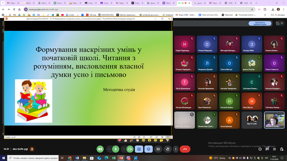 11 березня 2026 року на базі комунального навчального закладу «Черкаський обласний інститут післядипломної освіти педагогічних працівників Черкаської обласної ради» для учителів початкових класів та вихователів групи подовженого дня у рамках пролонгованого підвищення кваліфікації педагогічних працівників проведено. Завідувач відділу початкової освіти Людмила Добровольська розкрила зміст зазначених у темі наскрізних умінь відповідно до оновленого Державного стандарту початкової освіти (2025), познайомила із методами та прийомами їх формування під час уроків та позаурочної діяльності. У заході брали участь 100 осіб.
