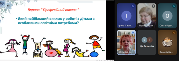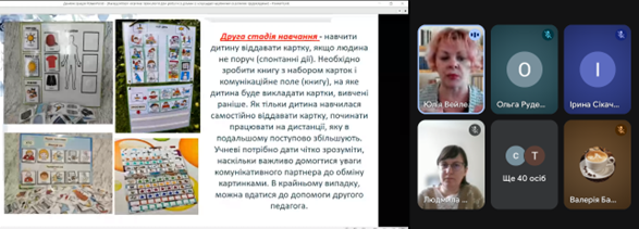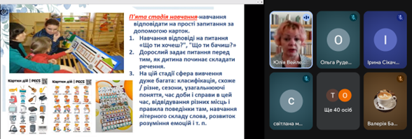 Юлія ВЕЙЛЕРТ, методист РЦПІО, ознайомила присутніх з актуальністю та необхідністю впровадження інноваційних підходів до подолання соціоадаптаційних труднощів у дітей з особливими освітніми потребами. Особливу увагу було приділено проблемам, які виникають у сфері міжособистісної взаємодії, емоційної регуляції та поведінкових реакцій, а також шляхам їх ефективного коригування в умовах інклюзивного освітнього середовища. Представлені матеріали ґрунтувалися на сучасних науково-практичних підходах та були спрямовані на підвищення професійної компетентності педагогів.