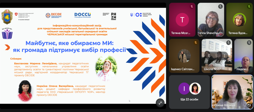 У ході заходу Норкіна Олена Валеріївна, ментор проєкту DECIDE, доцент кафедри дошкільної освіти та професійного розвитку педагогів КНЗ «Черкаський ОІПОПП ЧОР», представила концептуальні засади та особливості реалізації проєкту, акцентувавши увагу на ролі громади у створенні цілісної системи профорієнтаційної підтримки дітей і підлітків.